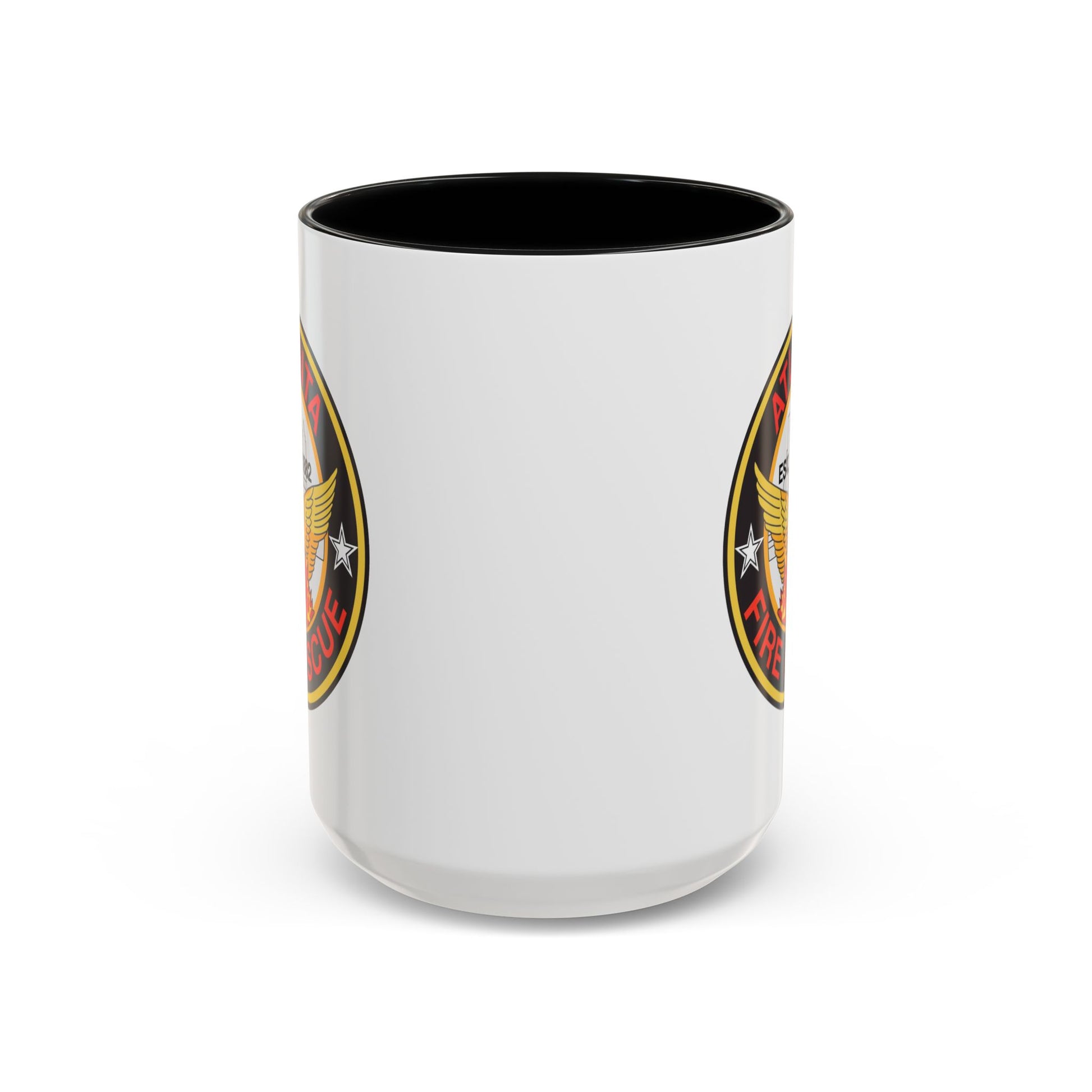 This listing is for a Premium Quality 15oz Black Accent White Ceramic coffee / tea mug with a double sided Atlanta Fire Department Seal. *
