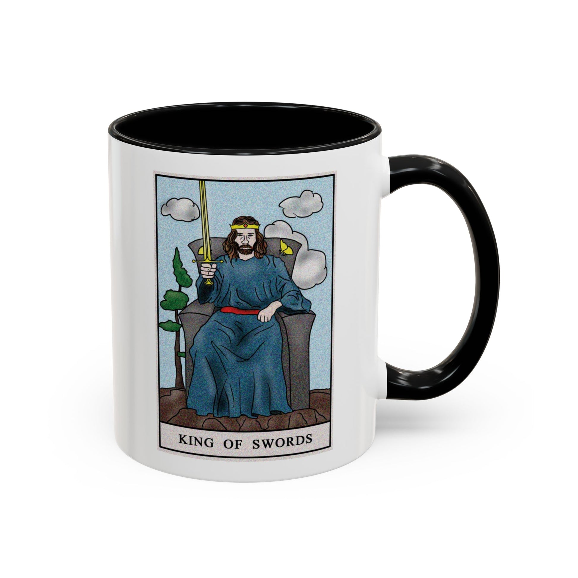 King of Swords Tarot Card Coffee Mug - Double Sided Print, Black Accent White Ceramic, 11oz by TheGlassyLass.com