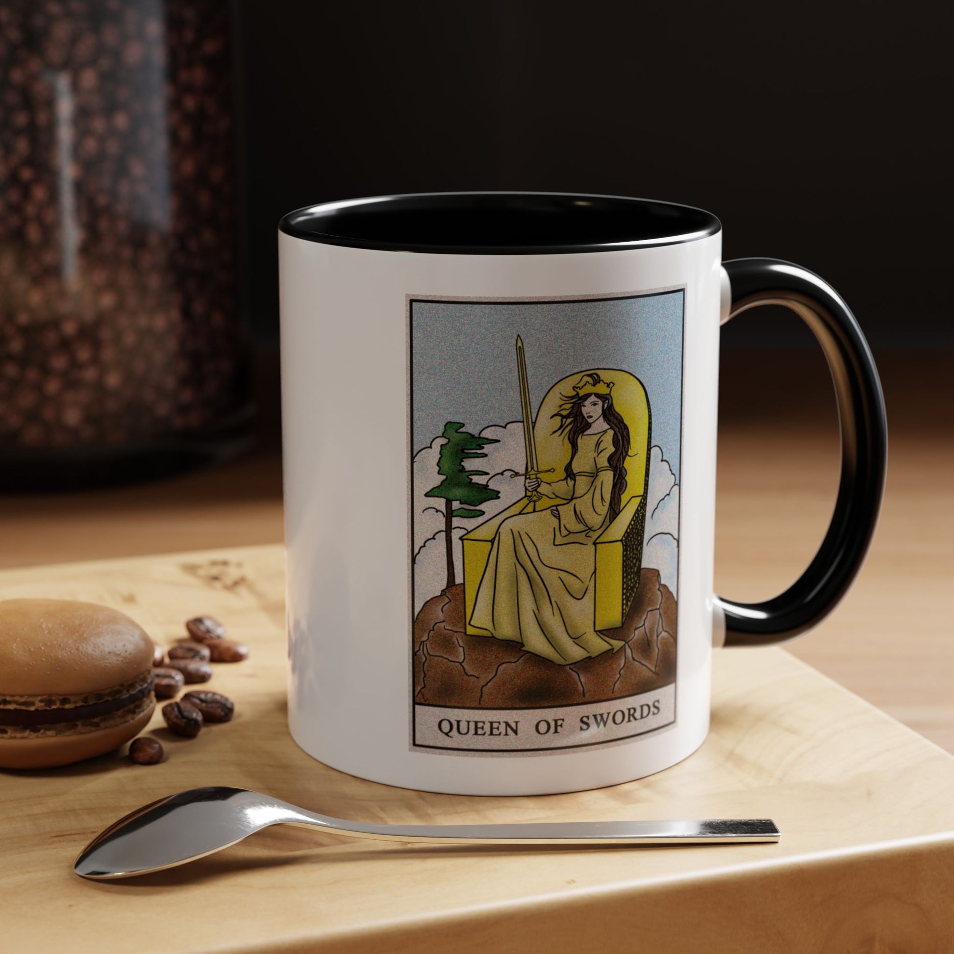 This listing is for a Premium Quality 11oz Black Accent White Ceramic coffee / tea mug with a double sided Queen of Swords Tarot Card*