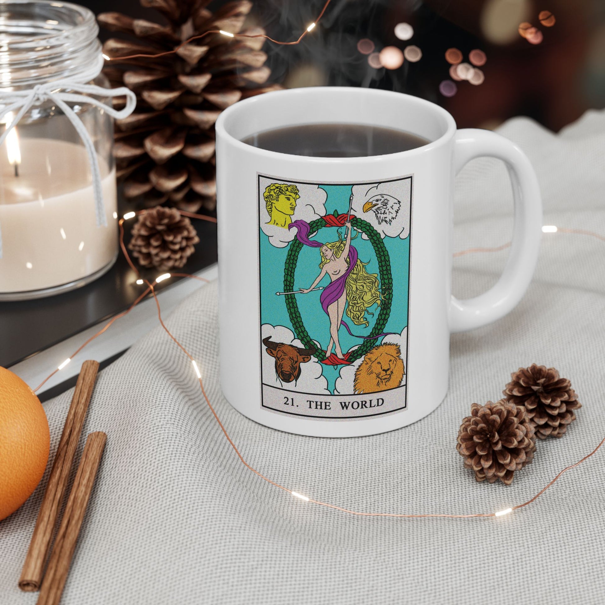 The World Tarot Card Coffee Mug - Double Sided Print, White Ceramic, 11oz by TheGlassyLass.com