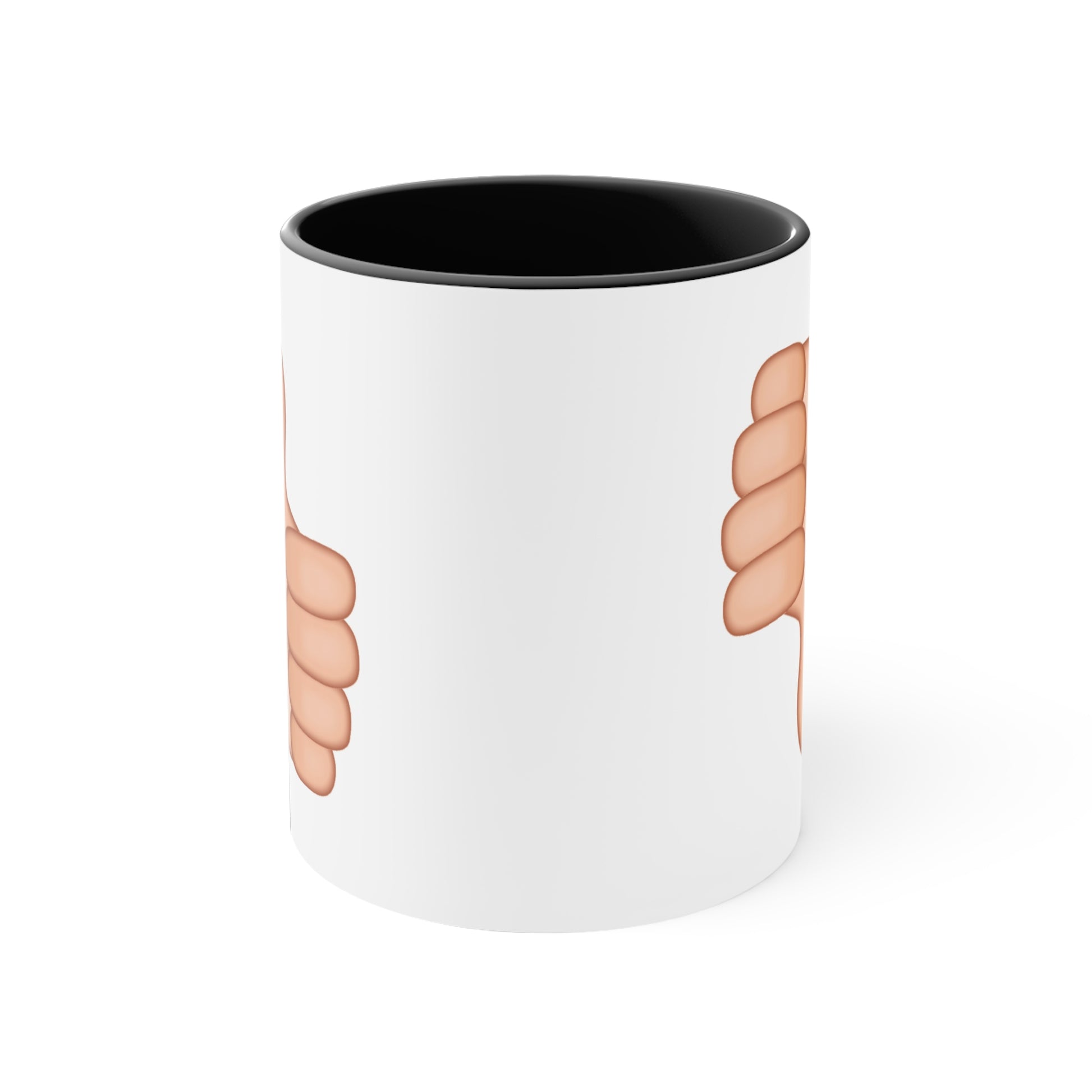 This listing is for a Premium Quality 11oz Black Accent White Ceramic coffee / tea mug with a double sided Thumbs Up / Thumbs Down Emoji *